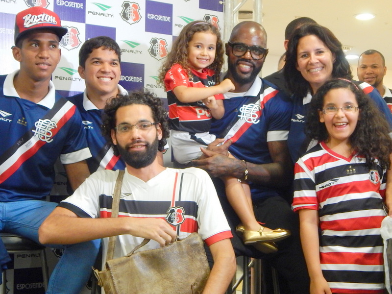Atrás de nós, uma família que mora no Curado. Pai, filha e avó. Cada um com uma camisa para ser autografada.