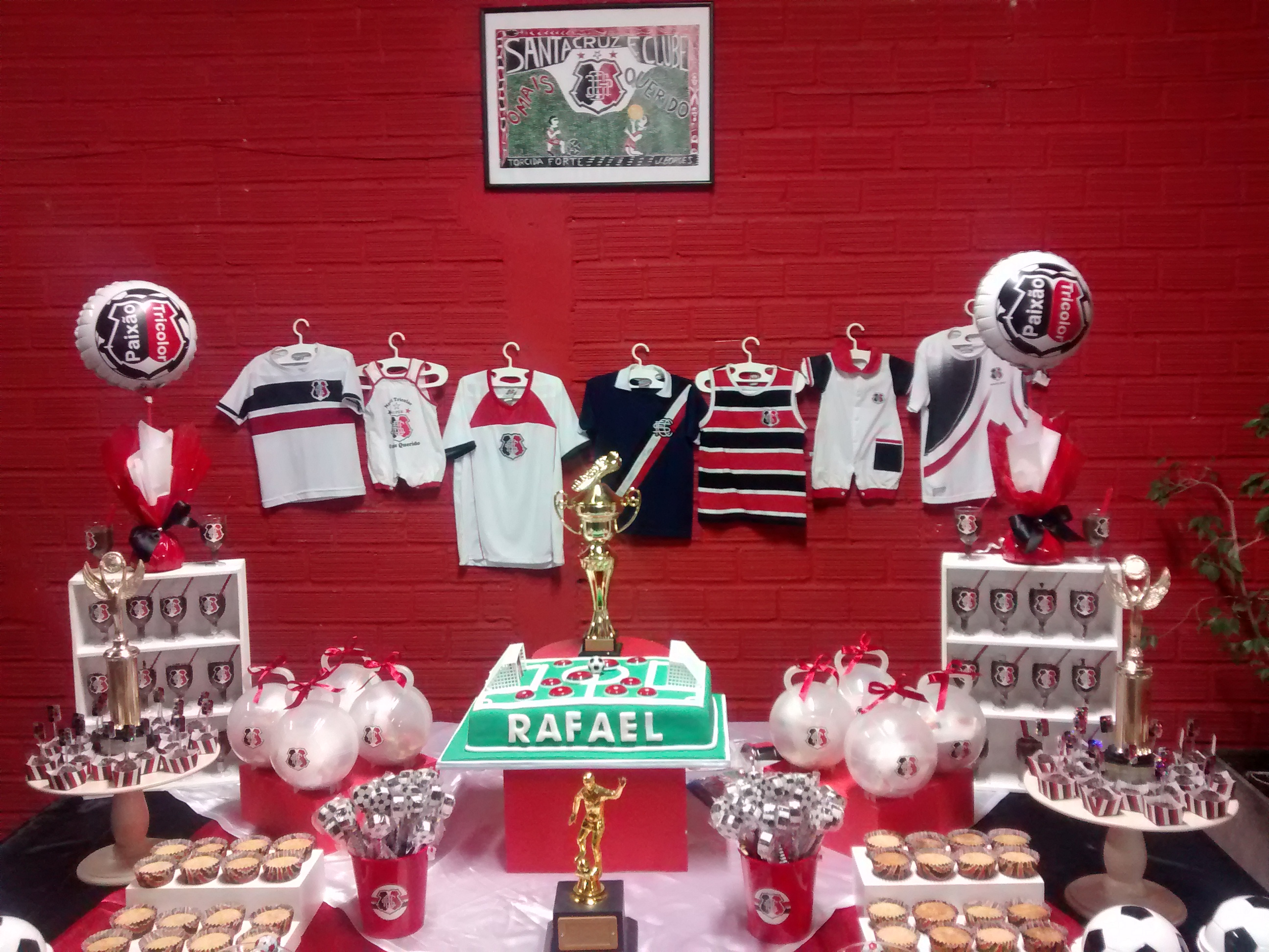 A mesa da festinha de Rafa tava uma beleza. O Santa Cruz em todos os lugares. O painel, as camisas que Refael tem do Santa Cruz. Desde a primeira roupinha até a de hoje.